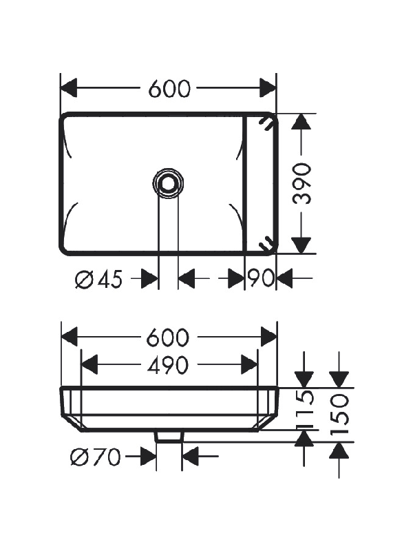 hansgrohe MellowTide Q – Wash bowl 600/390 without tap hole with shelf