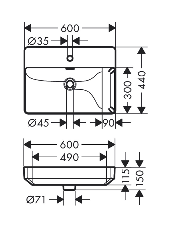 hansgrohe MellowTide Q – Wash bowl 600/440 with tap hole and shelf